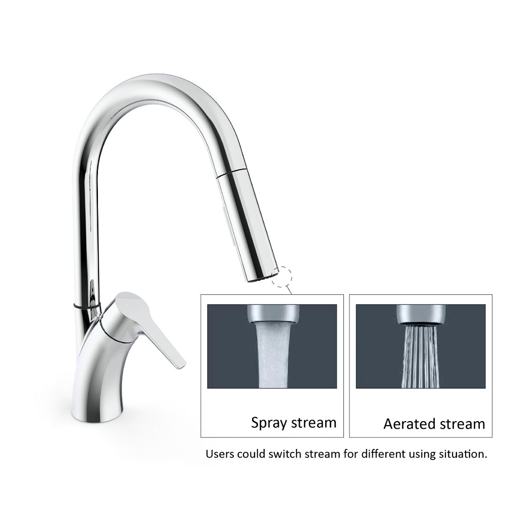 太極系列抽拉式廚房水龍頭安全而簡單的取得乾淨的家庭用水。為了這個目的,設計團隊發想的操作方式必須符合傳統的抽拉龍頭。於安全上的考量點必須在無鉛家庭用水的思考上進一步的將重金屬都涵蓋進去,以更高的安全來做為設計的骨幹。並且以可360度旋轉出水口的抽拉龍頭型式搭配可以切換的出水模式(花灑/水柱)來符合使用者的便利性。在抽拉龍頭的項目中我們需要補充一款價格親民但不減少功能的產品以滿足整體戰略。